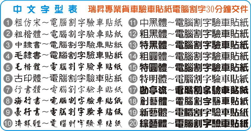 瑞昇專業驗車貼紙電腦割字, 專門製作各式大小貨車驗車貼紙、車體標示廣告貼紙, 店面告示、工廠標語、各種文字電腦割字, 專業快速便宜好貼,30分鐘交件, 外縣市可用郵寄、宅配或超商取貨付款。